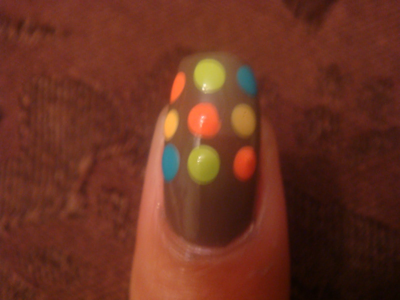 This is the finished nail. As you can see, there is no pattern as to what colors I used where, it was all random.